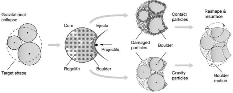 A new hybrid SPH–DEM framework is introduced to model the multistage dynamics in rubble-pile impacts, employing the surface contact particles and the interior gravity particles to describe large irregular boulders during long-term evolution. With the proposed method, the complexity of both the contact and gravity computation can be accelerated by ~100 times while maintaining the same level of resolution. The method is then used to simulate the DART impact on the rubble-pile asteroid Dimorphos.